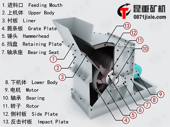 高效細(xì)碎機(jī)主要由上機(jī)體、襯板、篦條板、錘頭、擋盤、軸承、轉(zhuǎn)子、側(cè)襯板、反擊襯板等部件組成,高效細(xì)碎機(jī)為連續(xù)作業(yè)式設(shè)備。工作時(shí),在電機(jī)的帶動(dòng)下,轉(zhuǎn)子高速旋轉(zhuǎn),細(xì)碎機(jī)物料進(jìn)入第一破碎腔破碎,與轉(zhuǎn)子上的板錘撞擊破碎,然后進(jìn)入第二細(xì)碎腔進(jìn)行粉碎,最后在出料口排出。