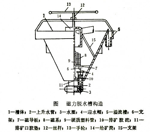 磁力脫水槽按磁性分類為永磁脫水槽和電磁脫水槽兩種,磁力脫水槽是由磁體、磁導(dǎo)體、排礦裝置、給礦筒、空心筒、槽體、返水盤等組成。