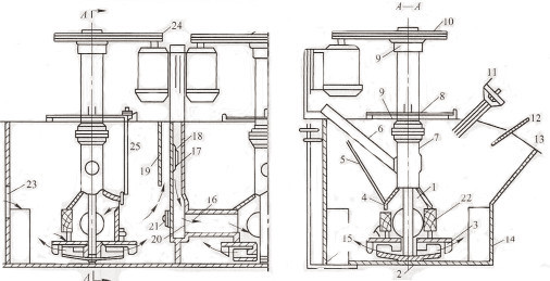 1、主軸;2、葉輪;3、蓋板;4、連接管;5、砂孔閘門絲桿;6、進(jìn)氣管;7、空氣管;8、座板;9 、軸承;10、皮帶輪;11、溢流閘門手輪及絲桿:12、刮板;13、泡沫溢流唇;14、槽體;15、放砂閘門;16、給礦管(吸漿管);17、 溢流堰;18、溢流閘門;19、閘門殼(中間室外壁);20、砂孔;21、砂孔閘門;22、中礦返回孔;23、直流槽前溢流堰;24、電機(jī)及皮帶輪;25、循環(huán)孔調(diào)節(jié)桿。