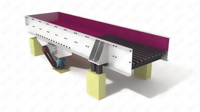 料槽配置單層篦條,可以對(duì)物料進(jìn)行簡(jiǎn)單預(yù)篩分,能有效去除原料中的細(xì)料和雜質(zhì),柵條間隙可調(diào),可防止物料堵塞。