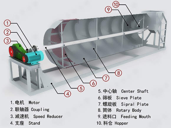 筒式洗礦機(jī)是由筒體、聯(lián)軸器、篩板、螺旋版、料倉(cāng)等部分組成,廣泛用于各種難洗的大塊礦石,分為圓筒型和圓筒加篩條型兩種。